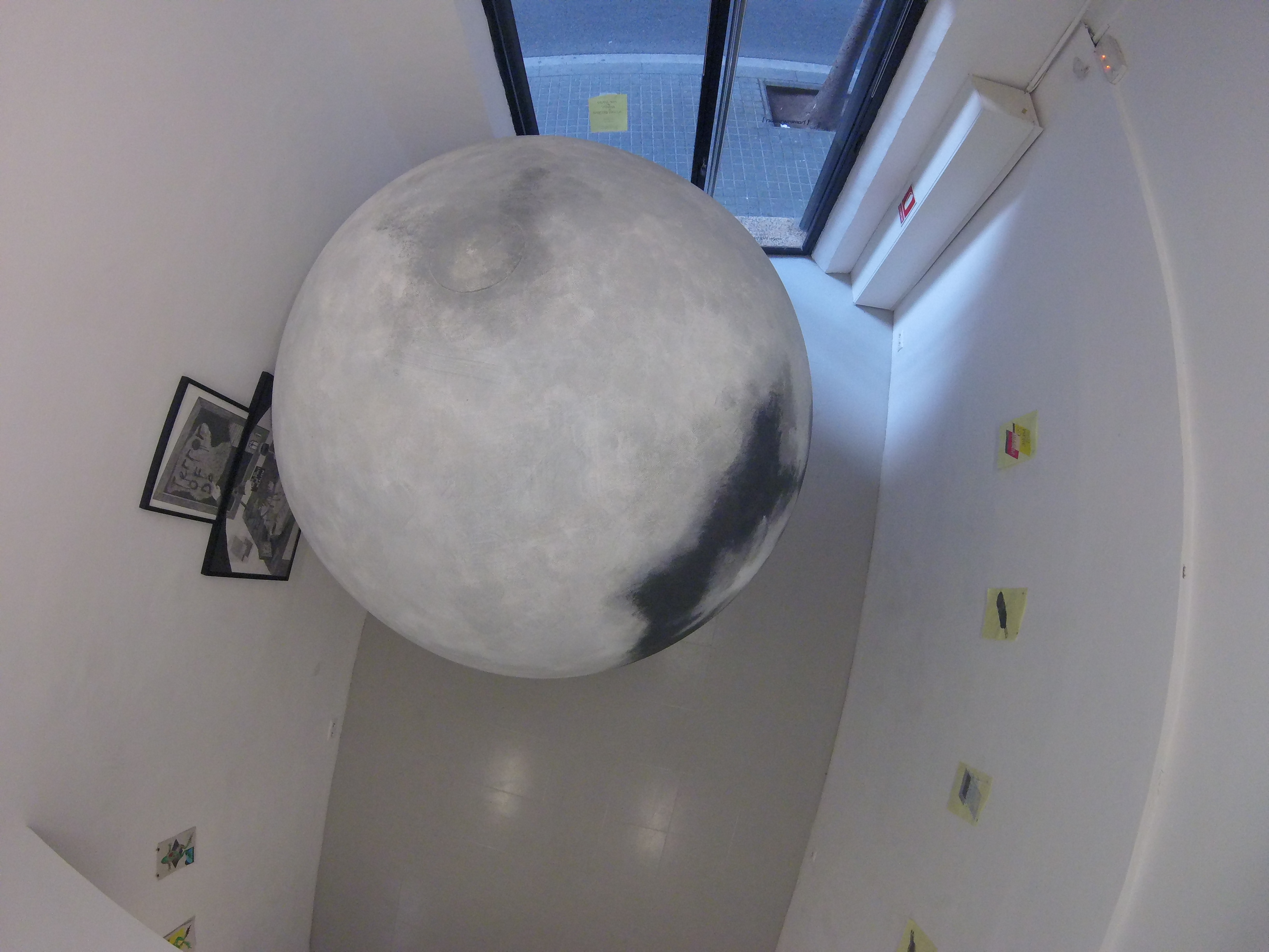MOON was built to roll around a 14’ wide room, eclipsing a series of wall mounted Sculptures, Drawings, and Small Paintings. To enter and leave the gallery as well as view the work Participant must push the Moon around the space. This was created as a choreographic tool for strangers to control viewership and the flow of the room.